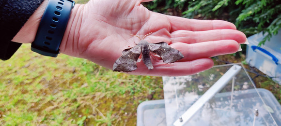 From the top: Rosy Rustic, Angle Barred Pug, Plain Golden Y, Elephant Hawk, Drinker, Catoptria pinella, Garden Tiger, Bordered Beauty, Scallopshell, Swallowtail, Common Emerald and Peach Blossom and my wife Michelle holding a Poplar Hawk Moth.